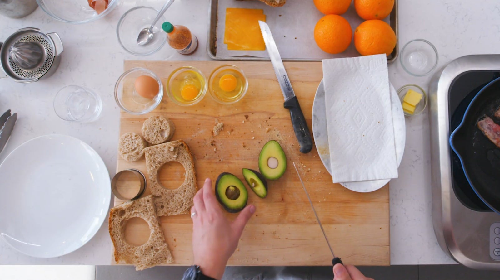 Still, you can make a sandwich with bread cut this way, and so Blevin continues after cutting his slices and trimming the crust in order to make a sort of bread-sponge. Fair enough. To add a little texture to the sandwich, Music adds an avocado to the recipe. This causes some degree of worry for Blevins, who admits to having never cut an avocado by himself. I get it. Not everyone cooks with avocados and that’s because sometimes they’re just mushy fuck fruit that people add to mac and cheese for no discernible reason. (This is true! I’ve seen people do this! It’s a sin!) That said, Music’s instructions are pretty good. Take your knife, find the side of the fruit, cut in until you touch the pit. The idea is to cut deep enough and then cut around the pit for easy removal. “You can’t cut right through it,” Music says. Blevins cuts right through it.