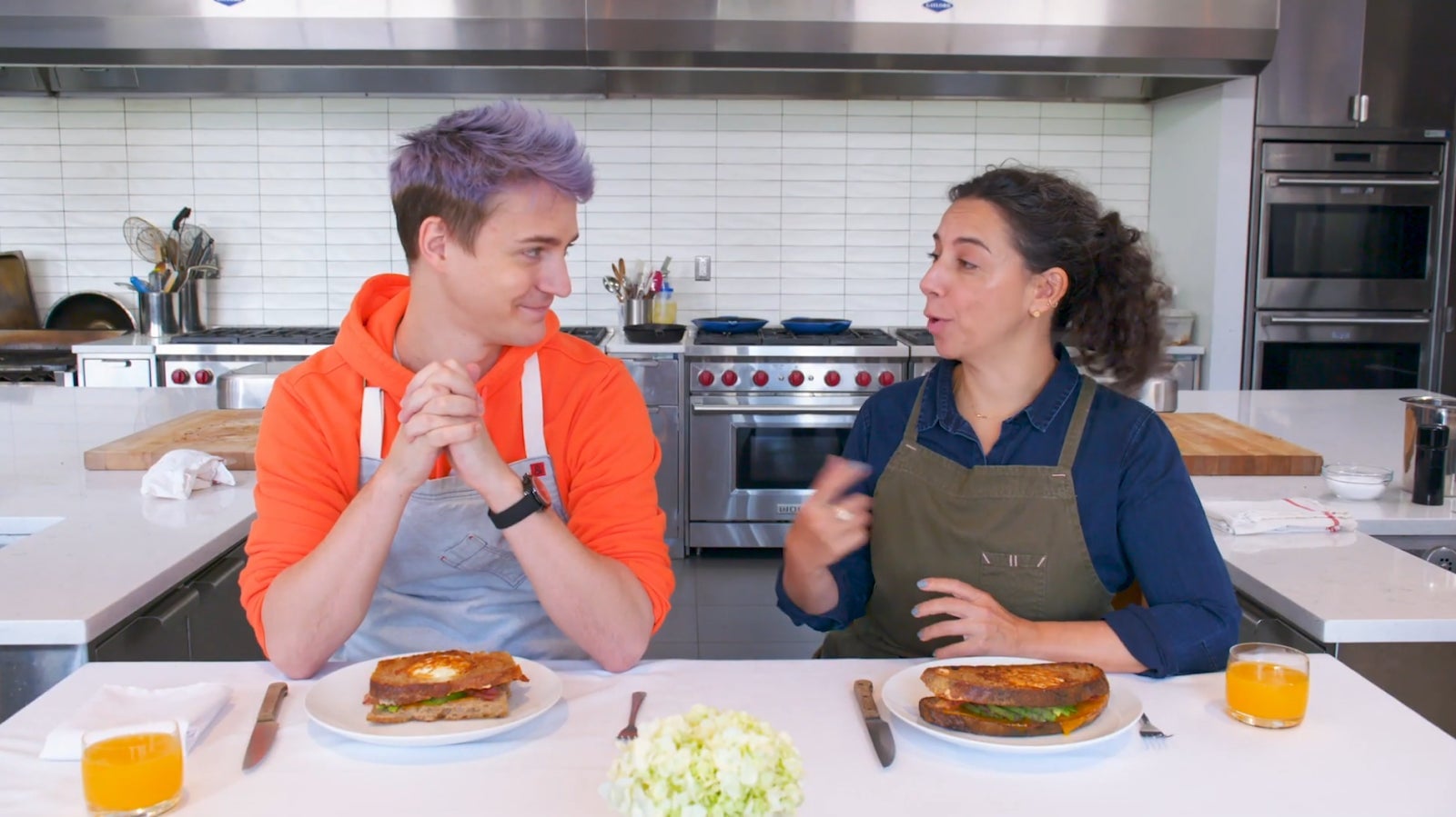 Here we see Blevins, who I stress has lived on this planet for nearly three decades, cutting off the ends of a loaf of bread—not a baguette, or a roll, or another type of bread you might reasonably make a hoagie from—and then slicing length-wise in order to produce the two pieces of bread for his sandwich. In his defense, he’s assuming this is a fancy sandwich. He’s in the kitchen with a professional chef, and I get that might lead to some overthinking. But also, again, it’s a sandwich. It is one of the most ubiquitous foodstuffs in the world. I don’t know what else to say. It’s a sandwich? It’s a sandwich. Two pieces of bread and stuff in the middle. You know, a sandwich. I don’t know what is happening here, but I do know that I find it very upsetting.