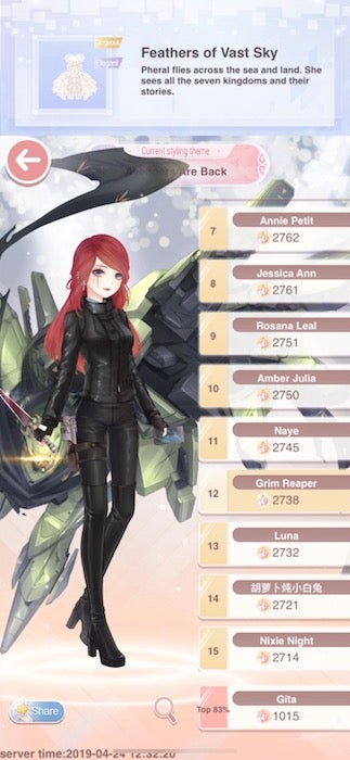 One of my favorite aspects of the game is the Competition feature. In all other aspects of Love Nikki, youāre playing against characters in pre-set outfits. Competitions are costume contests for every player in the game, and the results come from community members voting for the best looks. Everyoneās match ups are presented in pairs, and you have to decide to give one point to one of them. Whoever gets the most points wins the Competition, and usually gets a prize chock full of in-game currency.