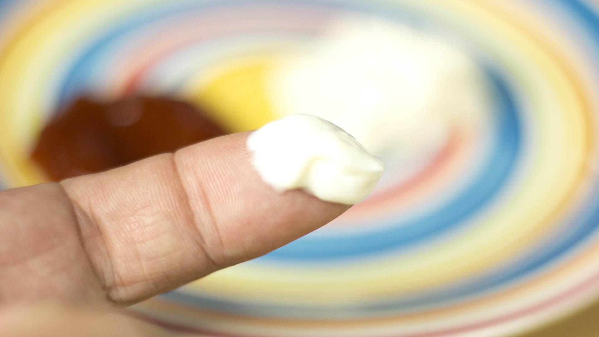 Mayo: The worst moisturizer ever. Mayo applies to the finger in still peaks initially, but heat temperature causes it to settle shortly thereafter. Note the edges of the glob. The mayo clings to the skin, as if being absorbed into it like some creepy invasion of the body I AM MAYONNAISE. BOW BEFORE MY CHOLESTEROLIC MIGHT.
