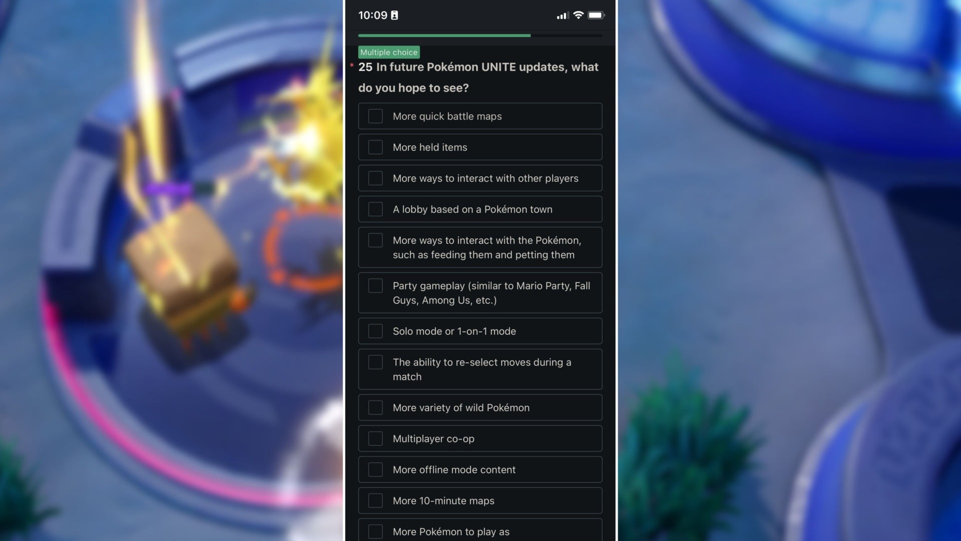 A number of questions the survey asks are quite intriguing. The fifth question, for example, wonders what kind of supplemental content you’d find interesting, with answers including “visual/story content about Pokémon Unite” (maybe like the League of Legends or Overwatch animated shorts) and “E-sports.” Later, the survey asks what you find frustrating about the game, with answers such as “It’s difficult to avoid relying heavily on teammates.”