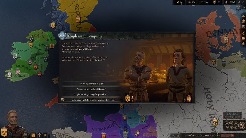 Crusader Kings III, then, is obviously trying to keep everything that made CKII special, while at the same time making the whole experience not just prettier, but easier to use as well. Graphical improvements are obvious in these screenshots, with nice touches like including individual character designs in their own story development screens (above), but more importantly you’ll also notice that the menu system—taking cues from Imperator—has been pared right back, with a lot of the stuff previously out there, in your face and terrifying to new players now tucked away, to be accessed only when needed.