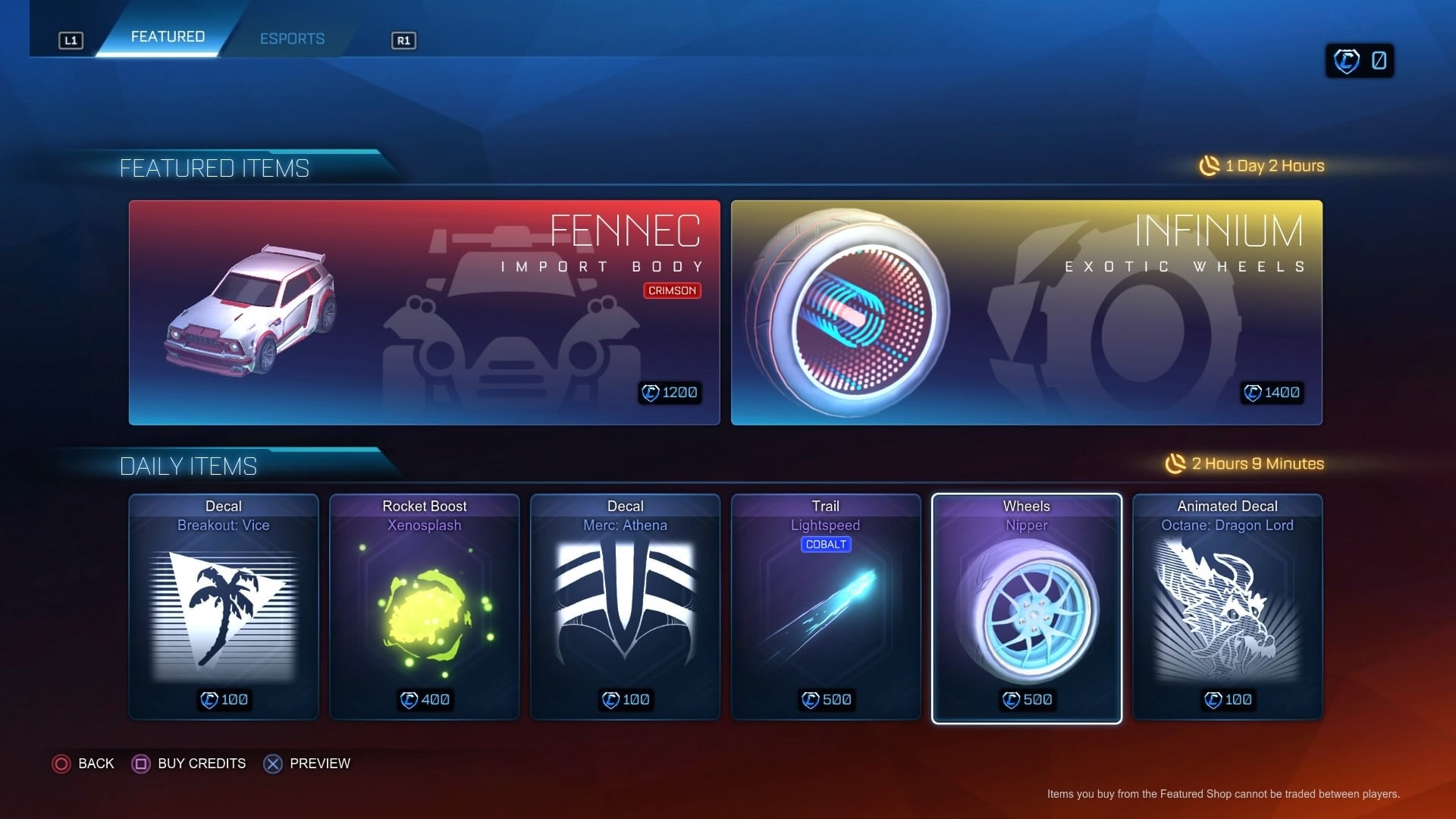They can also bypass this luck of the draw altogether if they already know what they want, by spending money in the new item shop. The catch is that the items are extremely pricey to buy outright, and you have to buy bundles of credits that are usually more than what you need. If you want to buy Infium Exotic Wheels for 1,400 credits, you need to buy a pack of 1,600 credits for $15, then have 200 credits left over.