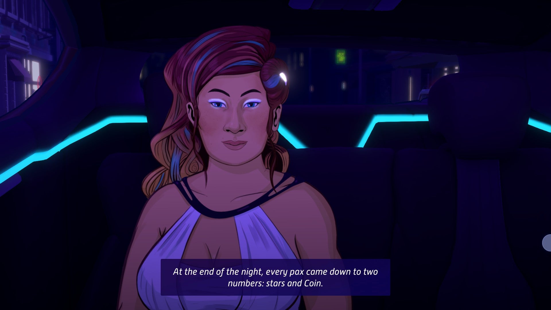 As I played Neo Cab, it occurred to me that Capra’s self-driving cars would prevent a lot of the unpleasant interactions Lina deals with, but automation isn’t presented in the game as a blanket good or bad solution. Ewing cites Uber’s stated goal of doing away with human drivers as one of the issues with which Neo Cab grapples. Lina is obviously interested in keeping her job, but even she has some ambivalence. There’s an underlying question throughout the game about whether humans, with their complicated emotions and motivations, are worth the hassle.