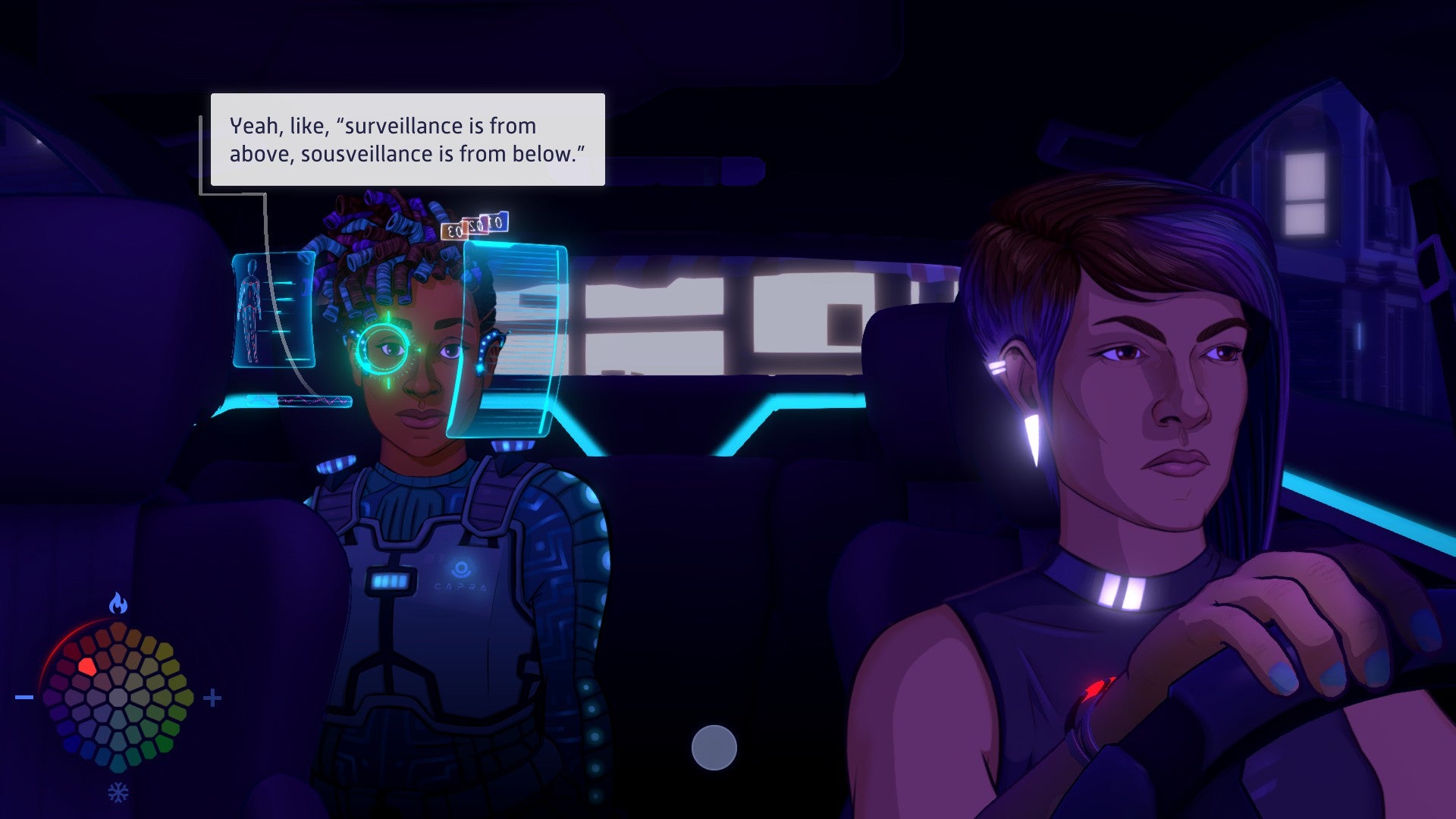 This look at humanity also plays out in Neo Cab’s emotional system, called the Feelgrid. In the game’s fiction, the Feelgrid is a piece of wearable tech that uses a color palette to tell the user what they’re feeling. Between colors representing major emotions like anger and sadness are shades representing gradations of those feelings. What color Lina is on the Feelgrid will open up or close down certain dialogue options or clue riders in on whether Lina disagrees with them or is humoring them.