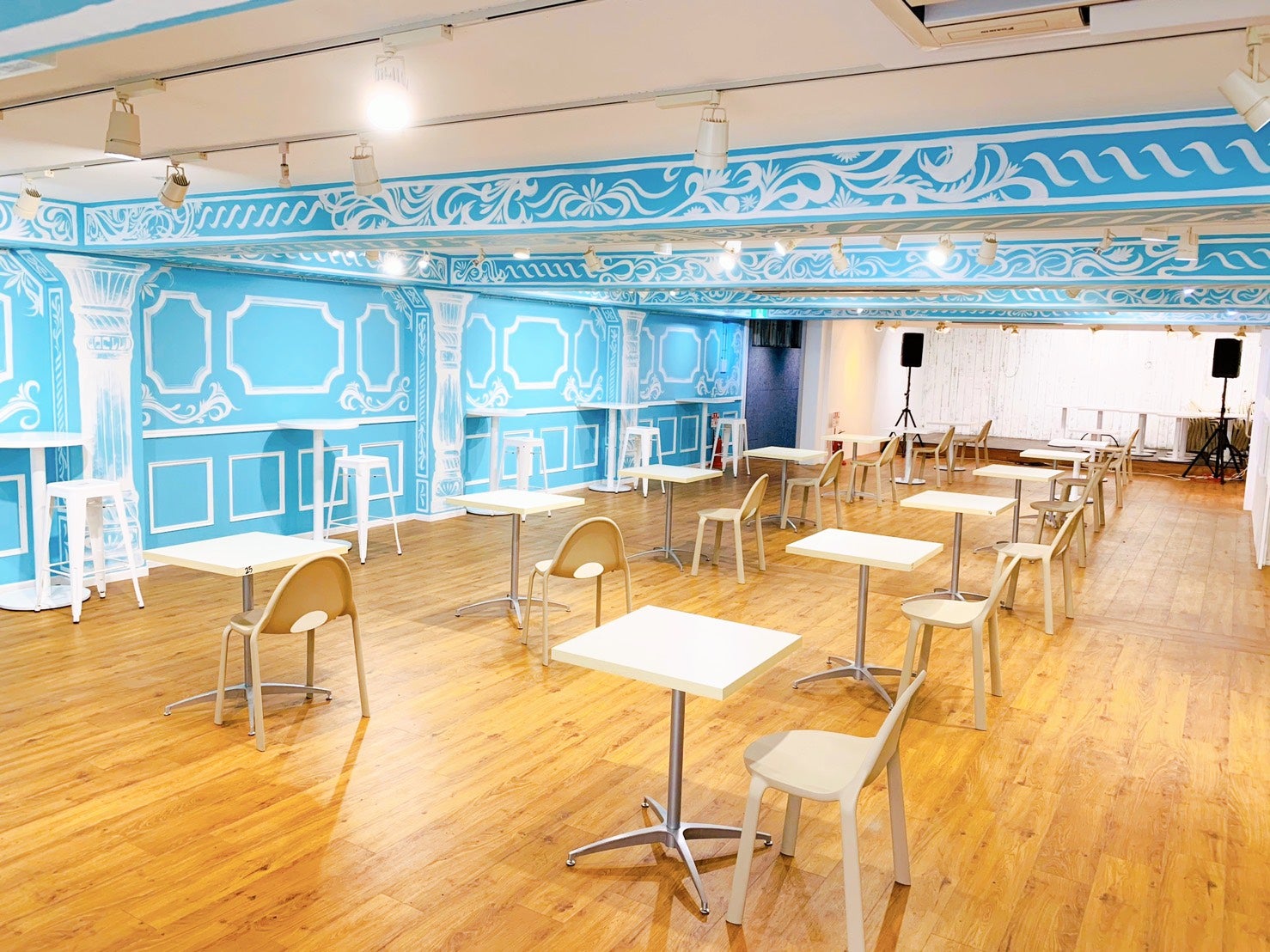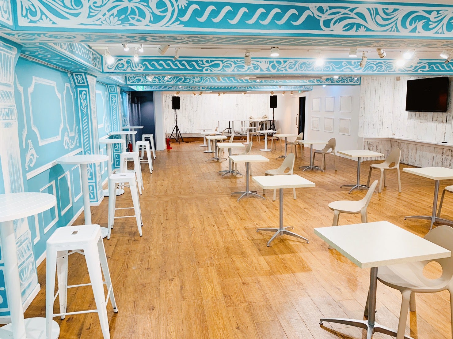 Tables are spaced two meters apart, and there is free WiFi, a TV, and electrical outlets.
