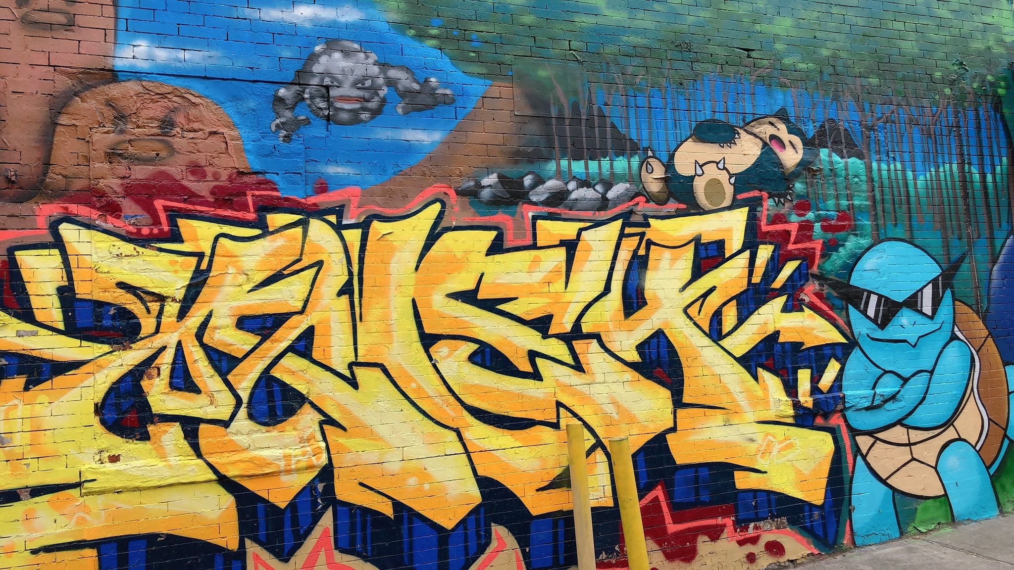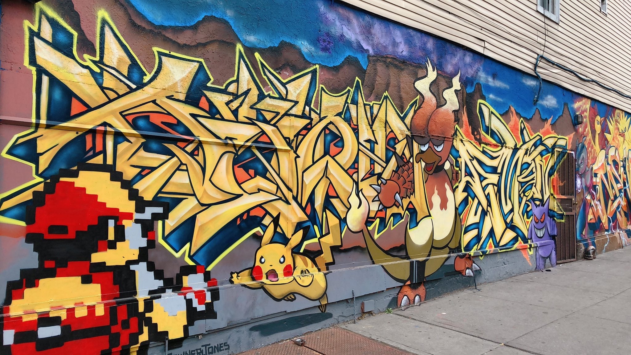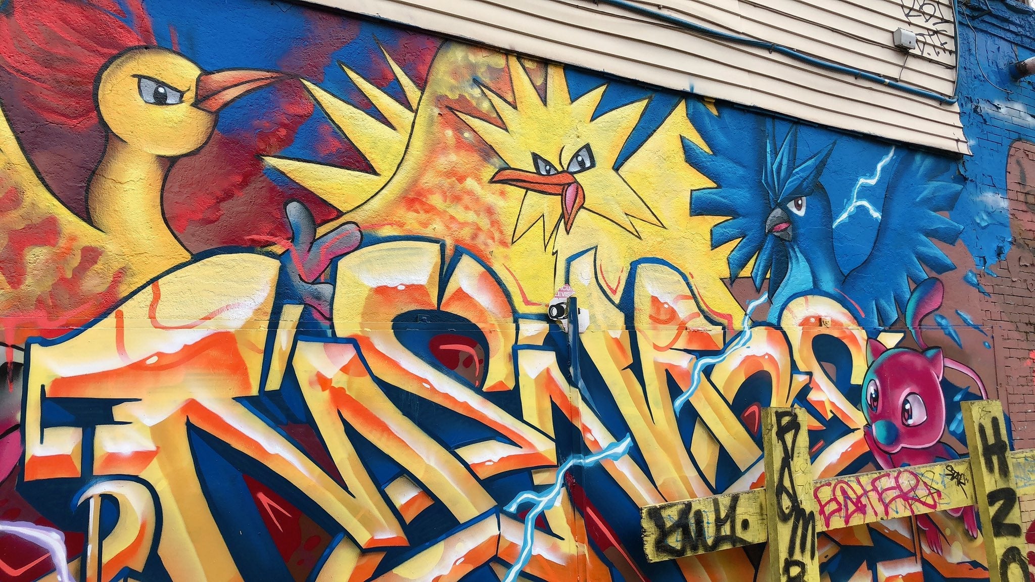 Spotted on a quick quarantine-breaking walk in Brooklyn: this fantastic Pokémon mural. Considering Red has no ‘mons of his own, I think he’s gonna lose this battle. (Click to see a full gallery!)