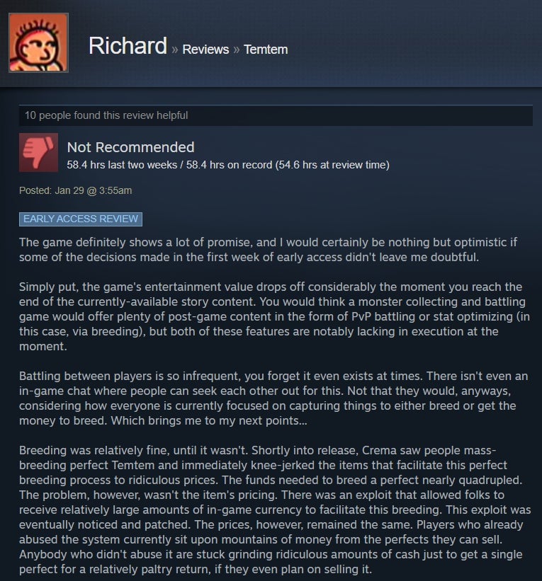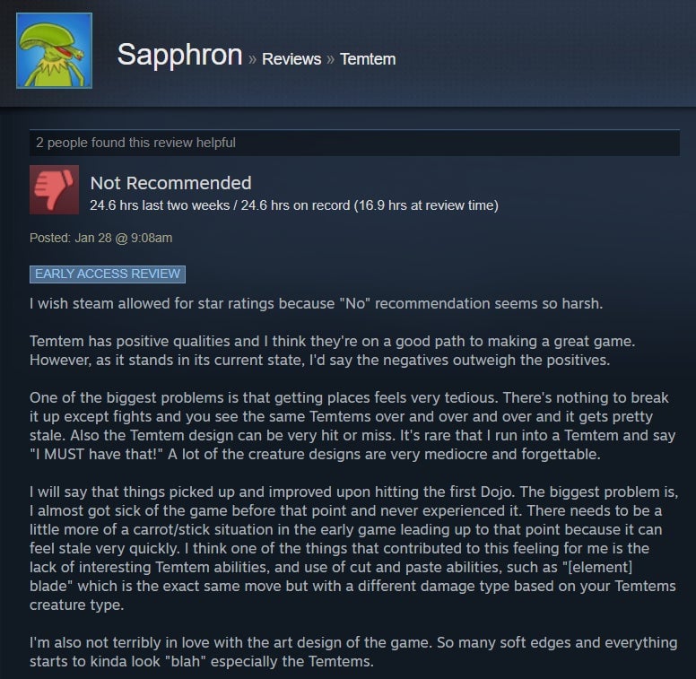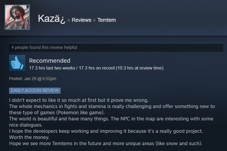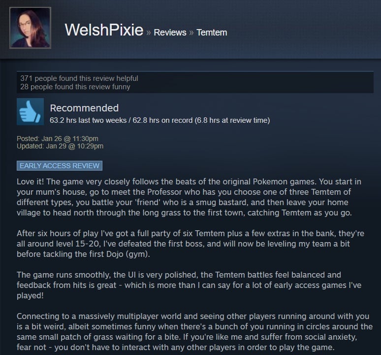 I’ve been dabbling in Temtem for the past handful of days, and while I’ve enjoyed the strategic battle system and higher level of challenge, I’ve found the game’s MMO aspect to be sadly underutilized. The game is in early access, though, so perhaps that will change with time. For now, Steam users are giving it the benefit of the doubt, with many praising its broad adherence to the Pokémon formula and the ways it diverges, like a stamina system and default two-on-two battles. However, some folks aren’t huge fans of the game’s MMO-like grind and lack of online features.