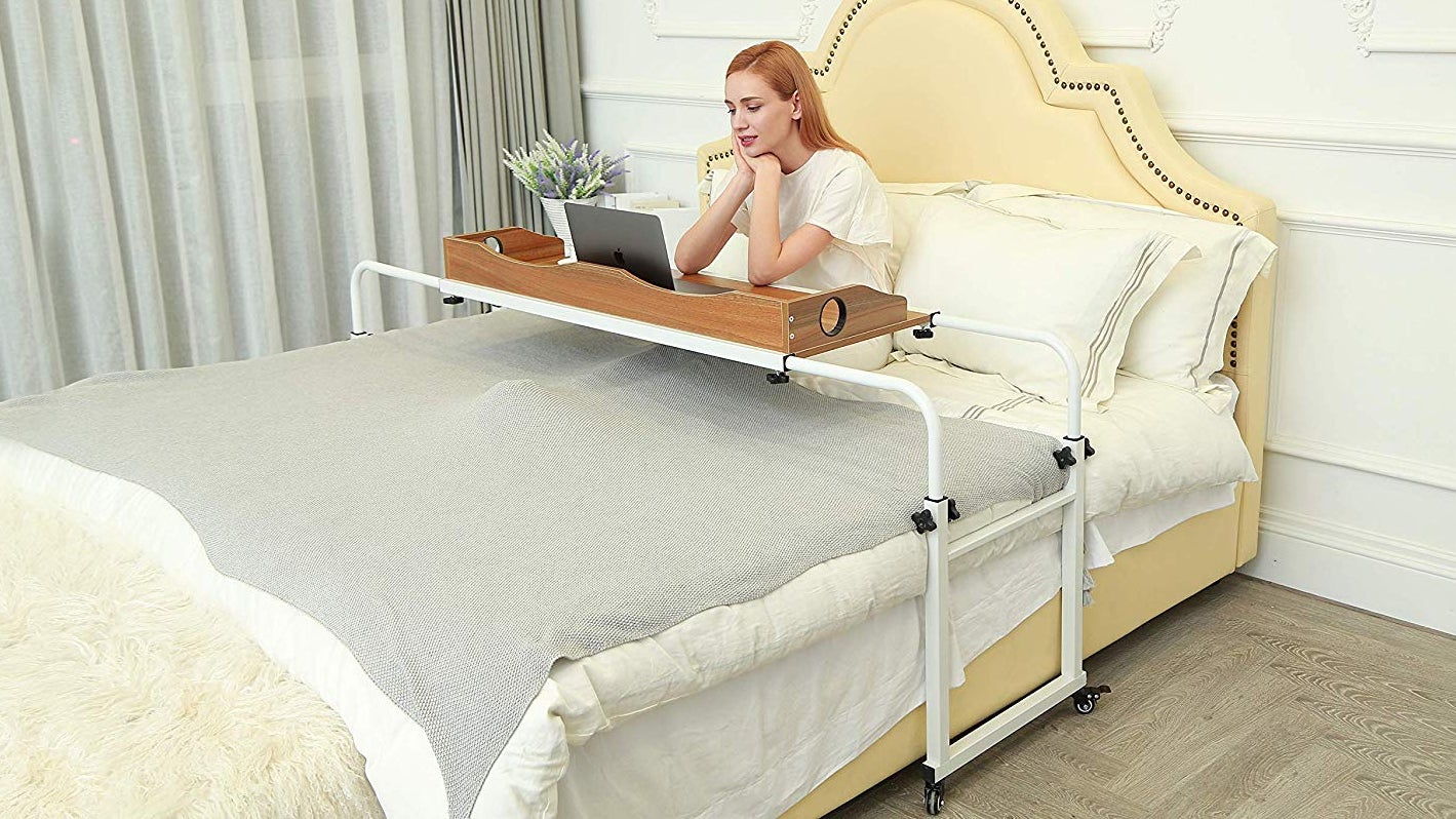 I have to spend a lot of time in bed lately, recovering from multiple surgeries following an incident last year. That means a lot more laptop time. Much of my computing is done on the table below, which covers a bed in a room much less tidy than in this product photo. Just imagine a large, bearded balding man here and several cats.