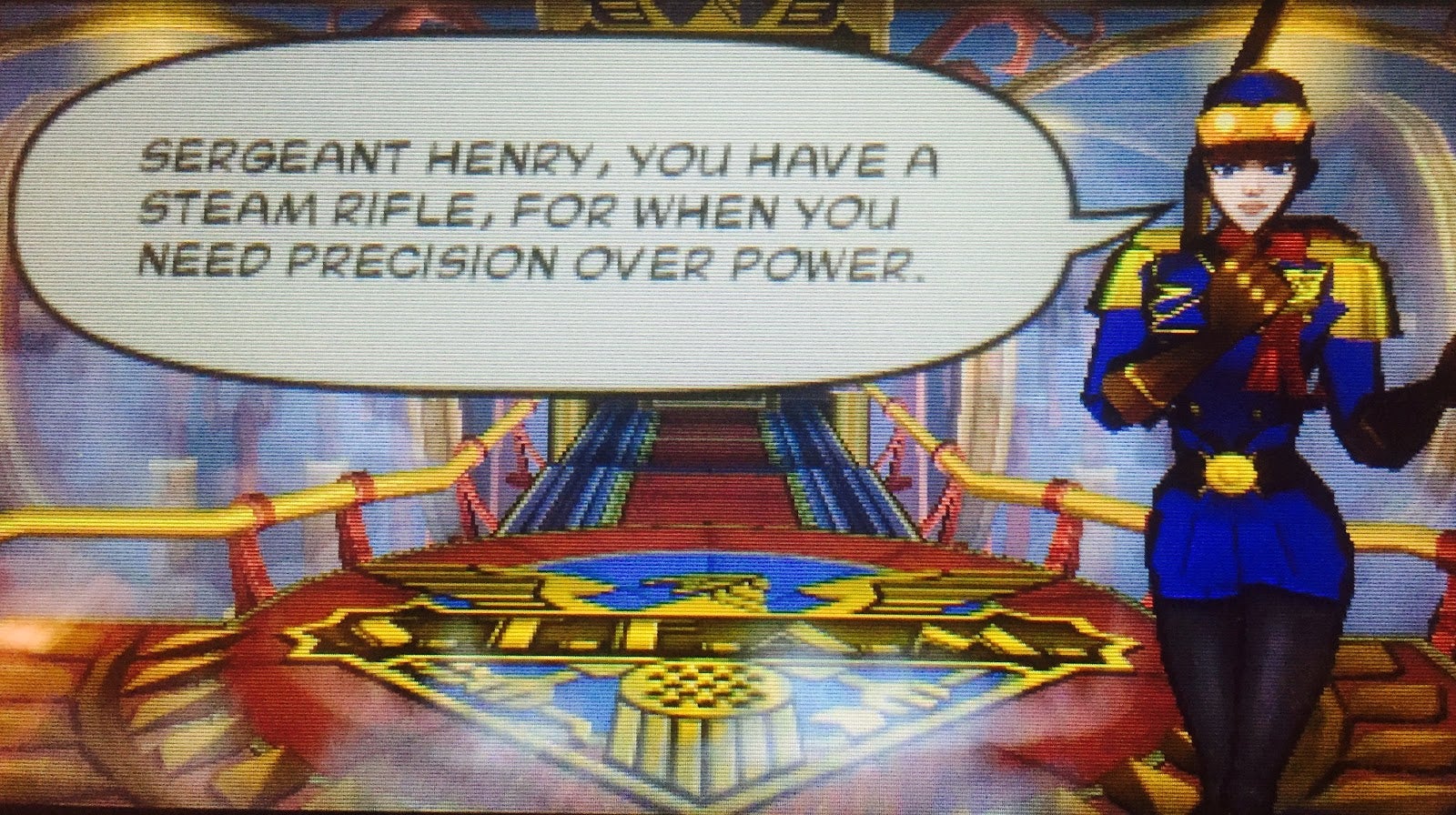 She then tells you about the weapons and gear you’ll get. For example…