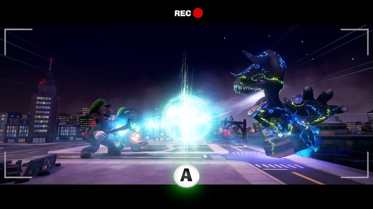 Eventually, after solving all the puzzles and filming all your shots, Luigi and Gooigi return the megaphone to Morty. He is so happy and believes that Luigi is a star! He opens a door to a new set, this one featuring a small city. And then the best boss fight in the game happens. Luigi and Gooigi team up to fight a ghost wearing a monster suit. The whole level feels like a love letter to Godzilla movies from back in the day, complete with a suit that falls apart as the fight progresses.