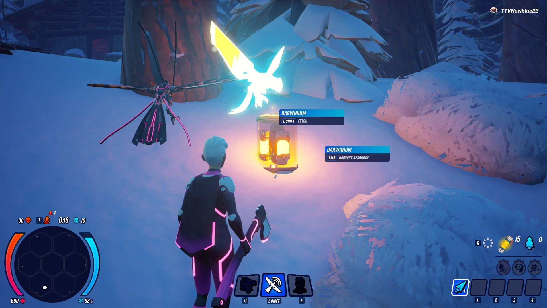 Darwinium is necessary for the game’s new class system. Players choose from one of three classes at the start of a match, then use Darwinium during the game to unlock and upgrade that class’ powers. Each class has a core power. For example, one gives you a robotic companion that can track enemies; its secondary abilities, unlocked with gathered Darwinium, let you become invisible or deploy a radar that detects signs of other players in range. As you gain XP and level up, you can unlock different additional powers for your class, such as the ability to deploy a turret. Another class gives you wings that let you hover and divebomb, and the third class gives you a grappling hook and the ability to deploy a temporary shield. Getting Darwinium from drops or around the environment is necessary to use your class powers during a match, and it can also be used to upgrade class-specific passive bonuses, such as increased damage to tracked enemies.