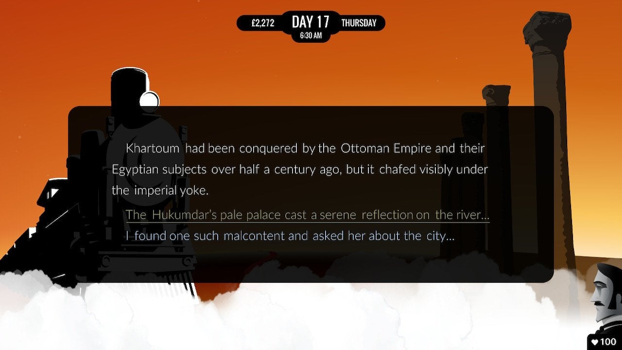 The Switch port of 80 Days is so seamless that other than my vibrating Joy-Cons, I didn’t think about it too much. If you’ve never played the game before, picking it up on Switch is a great place to start. Since I had played before, it was nice to not have to learn the trappings of the game as I played—though it can seem like a lot on a first playthrough, there’s not much to do beyond picking dialogue choices and making sure you catch your transportation on time. For maybe the first time while playing 80 Days, I allowed myself to soak up its rich narrative and opened up to it in more personal ways.