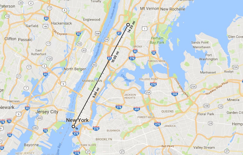 Pikachu to Raichu: 50 km (up and down the length of Manhattan, NY)