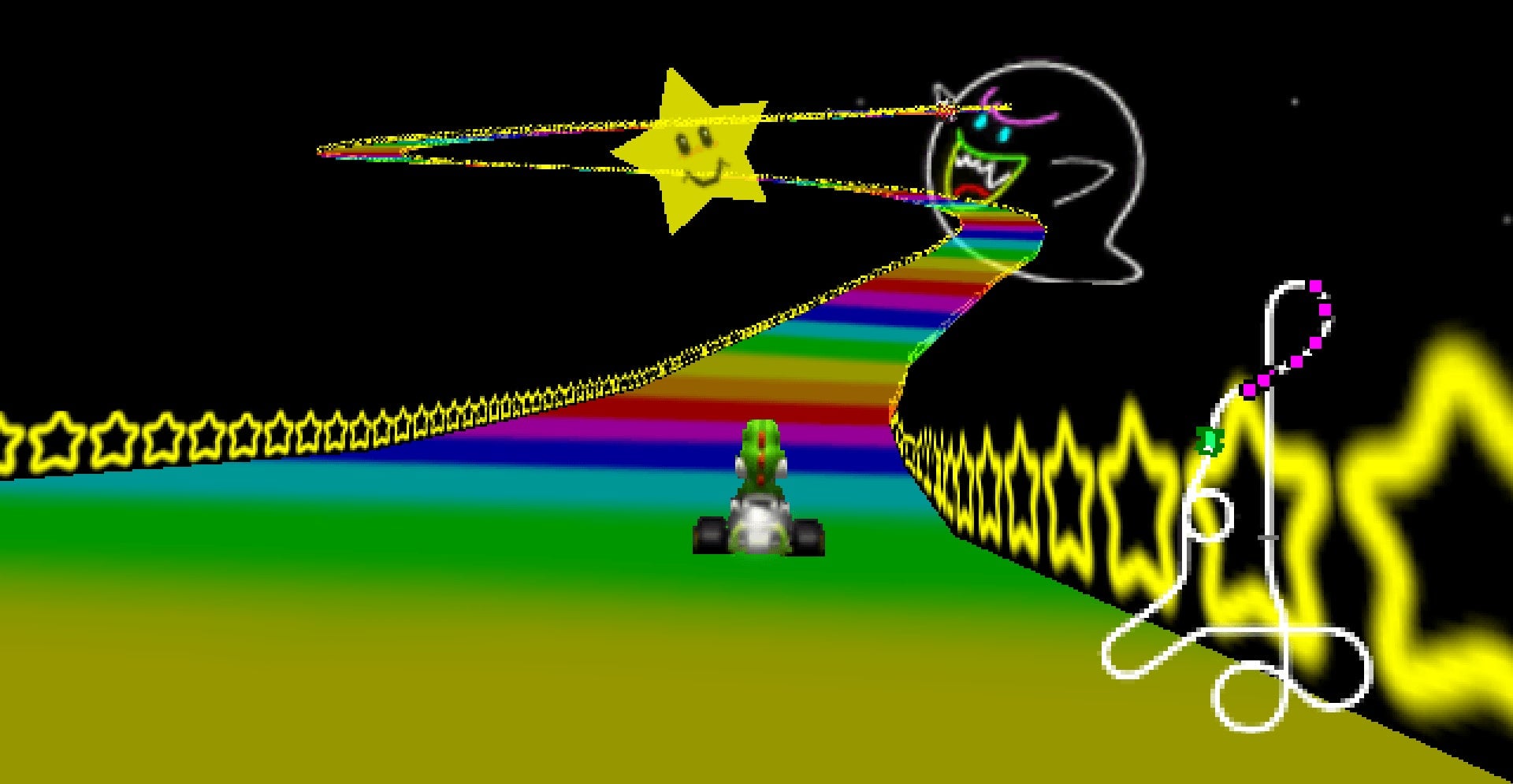 For example, one of the most popular Mario Kart games, Mario Kart 64, is surrounded by rails. To find shortcuts and score faster times, players had to figure out points in the track where perfectly timed boosts and turns could allow them to leap over the guardrails and onto different parts of the track. One of the most famous skips on this version of Rainbow Road is known as the “Spiral Jump” and can shave off 10 seconds off your final time.