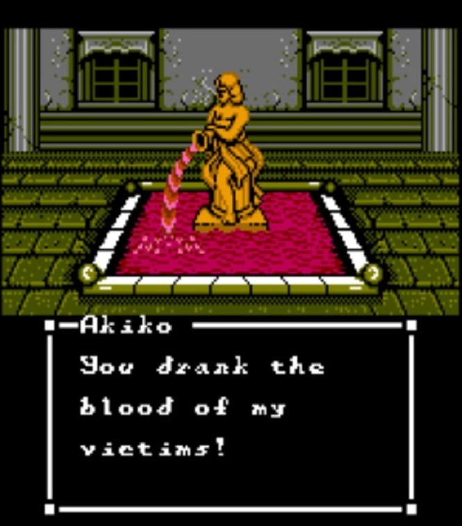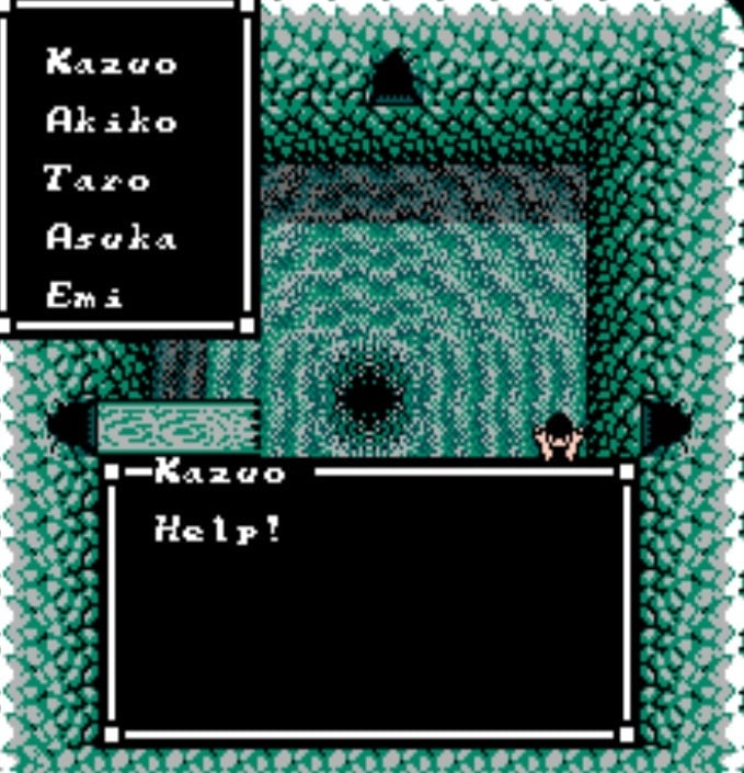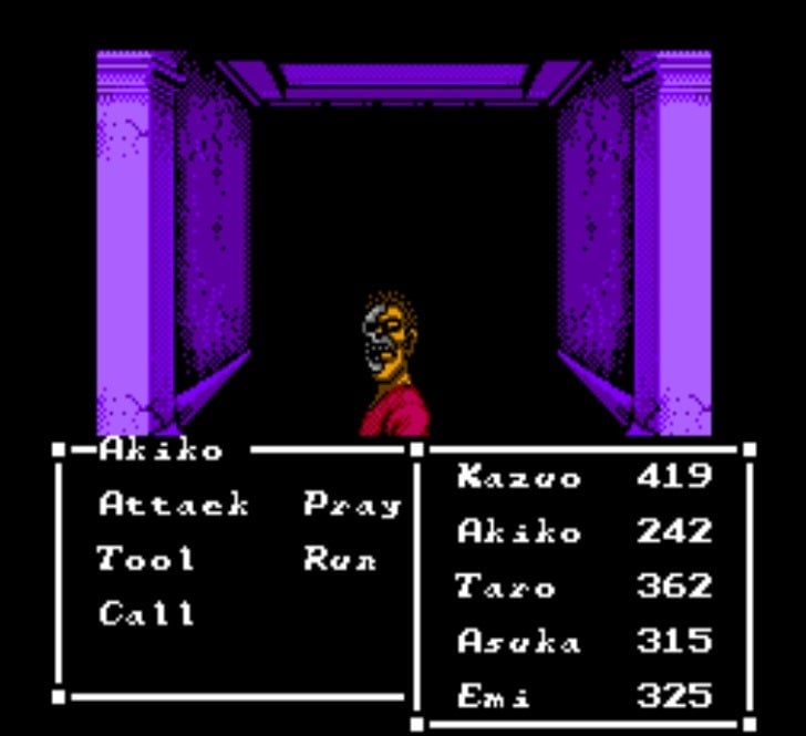 Even with the limited graphics and palette, the eponymous Sweet Home evoked horror through its dark corridors and disturbing backgrounds. Random battles and gruesome monsters amplified the sense of tension. The infamous Resident Evil cut-to-the-door loading screen had its origins here, as did the anxious sense of anticipation of wondering what was coming next. The house has traps that hurt you, a forerunner to QTEs that require the correct option to avoid dropping lights and obstacles like massive boulders. There are strange puzzles that require strange items to solve, creepy dolls littered throughout, and obstacles that can curse or paralyze the characters who will then need to be rescued. Unlike other RPGs where resurrection is a spell or a bottle away, deaths are permanent in Sweet Home. The stakes are high because, once a character dies, thatâs it.