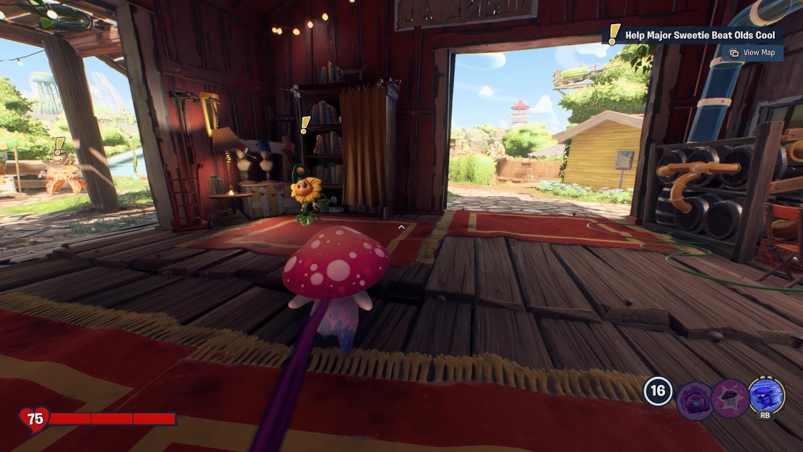 So far, I’ve been having the most fun in Town Center, the plant-based adventure zone. It’s almost like being in a third-person Plants. Vs. Zombie role-playing game. It starts with a mission: a sunflower assigns players to help get rid of zombie machines that are causing plants to dance uncontrollably. Players must seek out an underground dance club, recruiting non-player plants to their side along the way. After that, there’s an escort mission in which the player and his posse must defend a lawnmower, which seems like a conflict of interest. It’s a fun little solo story in this only multiplayer shooter, and it’s the first of many.