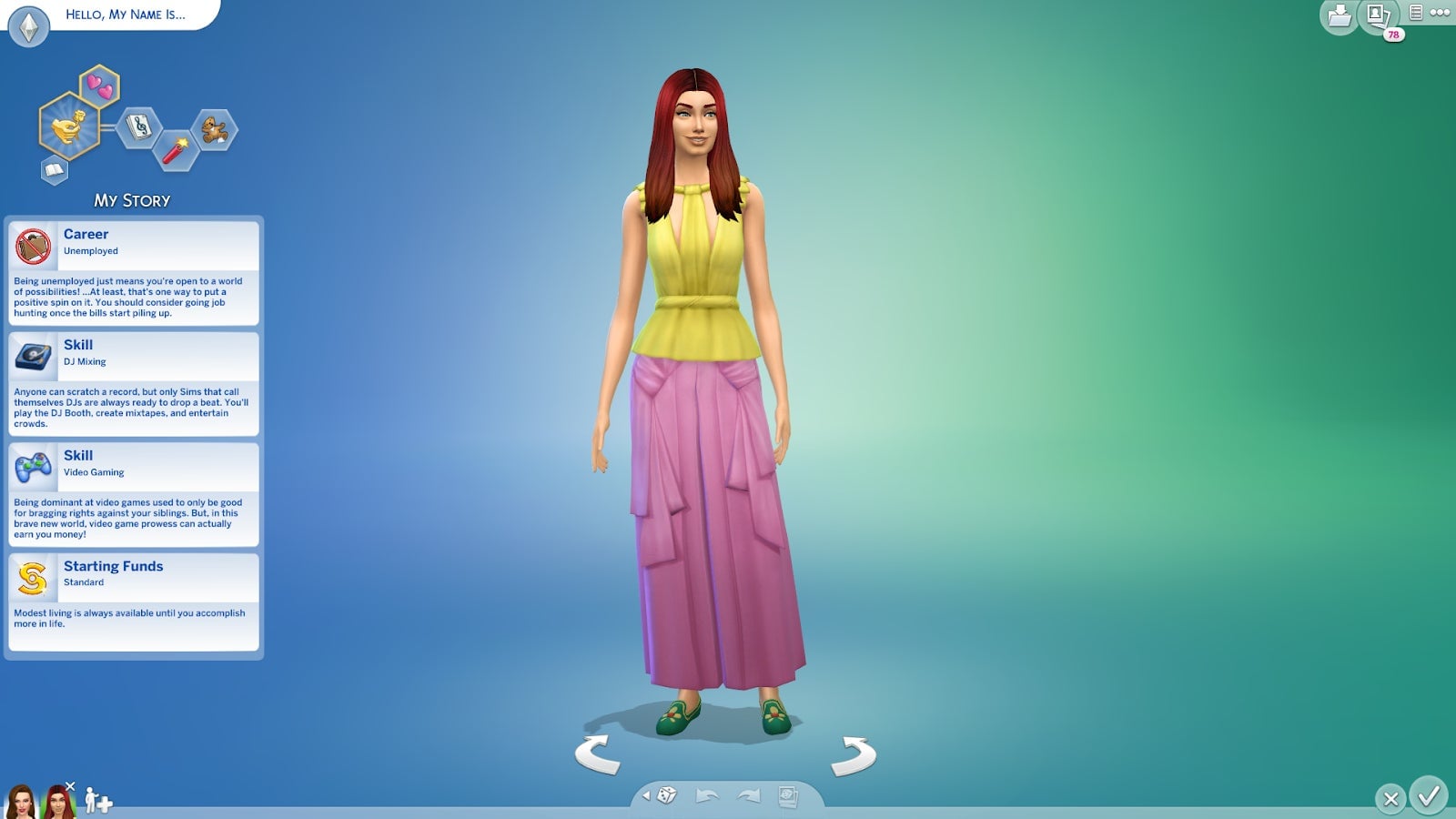 Here’s a Sim I whipped up in literally a few seconds. I answered a few questions about what this Sim likes to do on the weekend, whether or not they’re into romance, or if they like gardening—the questions are random, and you can always skip over one if you keep getting the same few questions over and over. I got a Young Adult Sim with points in the DJ Mixing and Video Gaming skills. She’s a Hot-Headed Serial Romantic who likes music and hates children. I actually almost never play Sims that have these Skills or Traits, and the idea of working with this character instead of making yet another painter has made me more excited to play. I can just imagine the kind of life she’d live—a jet-setting DJ who doesn’t want to settle down. Maybe she’s a bit of a diva.