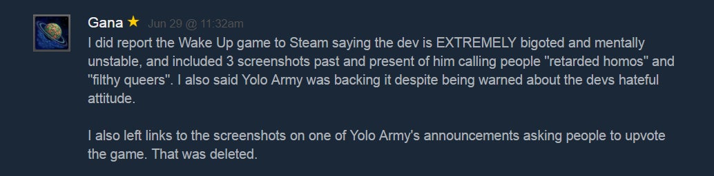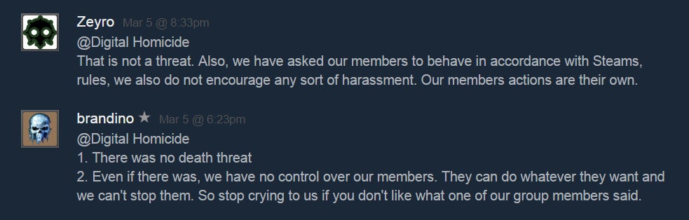 âWe voice our opinion, and when devs are âcaught in a lie,â they act angrily,â he added. âBut the users on Steam can check out the group and our rules and see that weâre definitely not the bad guys here.â
