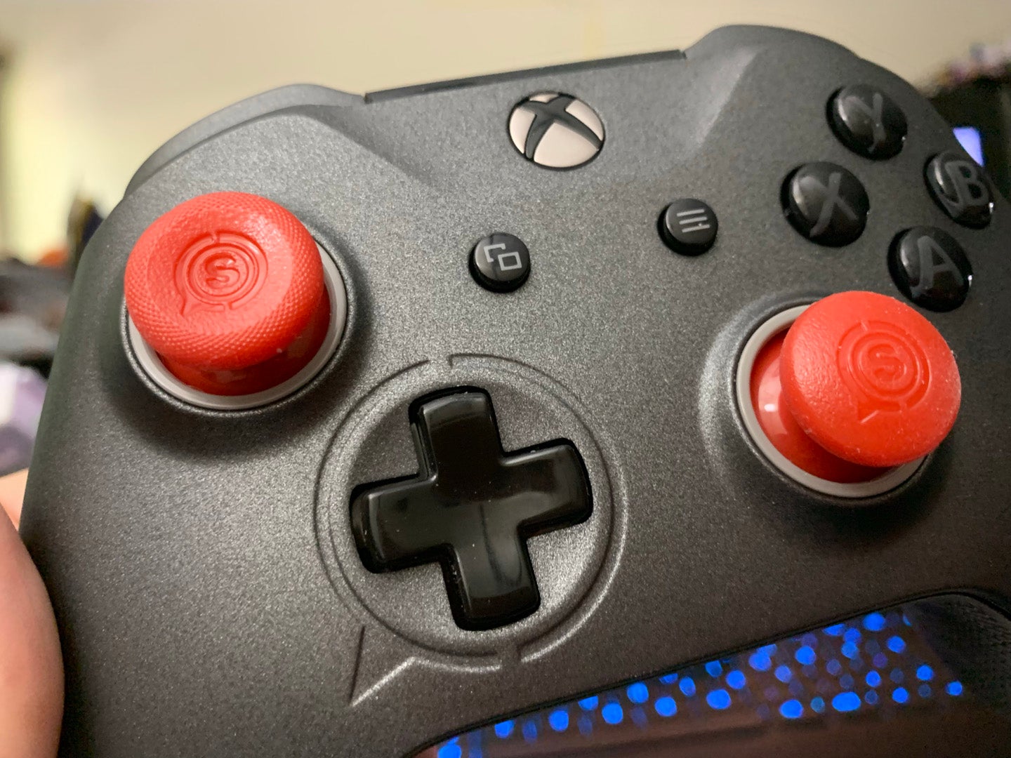 Taking off the faceplate is also how users swap out thumbsticks and those little plastic rings around them. In the photo below, I’ve swapped out the stock sticks with a pair of red ones that belong to a kit for Scuf’s premium PlayStation 4 controller, the Vantage. Nice to know the two are compatible.