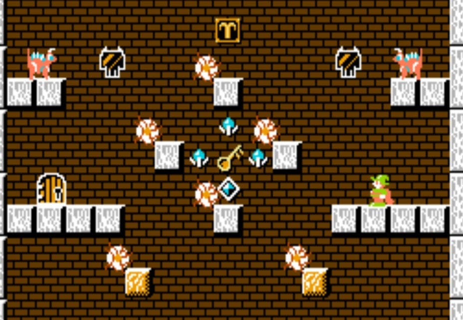 Solomon’s Key starts off simple An enemy goblin is trapped on a breakable stone block that impedes Dana’s path. After Dana breaks the stone, the goblin falls and disintegrates, teaching players the basics of how the block party works. There’s also a Bell of Lyrac above the Ram symbol in the room that’s totally optional. Players can form a stair with the blocks to climb the room and ring it, which liberates a fairy from the exit. To finish the level, grab the key, save the fairy, and leave.