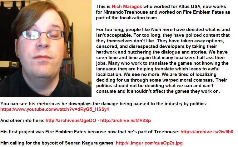 When it comes to Fire Emblem Fates, Rapp has not been the only person of interest. Nich Maragos, a former Atlus USA translator, now works at Nintendo. His first project at Treehouse was Fire Emblem Fates. In recent weeks, he’s been one of the people targeted by this group, in the search for a boogeyman. (I’ve cropped part of it out, but the whole image is here.)