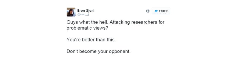 There’s Eron Gjoni, author of the relationship screed against Zoe Quinn that kicked off GamerGate, saying that “attempting to get people fired for holding problematic views is exactly the sort of thing you’re supposed to be against.”