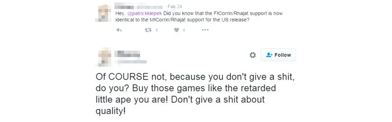 Rapp doesn’t translate or localize games, but she has been outspoken on Twitter about online abuse against women in gaming. She’s been labeled an “SJW” and has received the requisite online blowback. Last October she Tweeted a list of abusive comments she said she’s received, people calling her “cancerous” and a “feminazi face piercings bitch.”