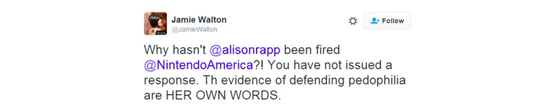 Walton claimed she spoke with Nintendo of America’s “supervisory line” and reported Rapp. She then retweeted voices of support from people, many who publicly associate with GamerGate, while saying she was “not GG” or “AGG” [anti GamerGate]. She added that she didn’t “suggest to @NintendoAmerica supervisors that @alisonrapp be fired,” but she “absolutely” thinks she should.