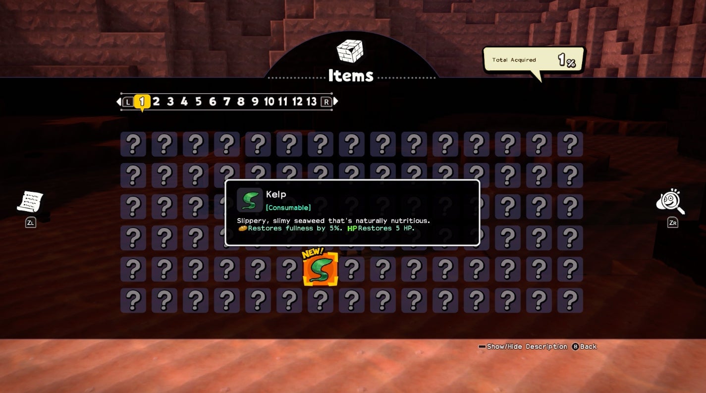 Kotaku Editor-In-Chief Stephen Totilo was delighted to acquire some Kelp but had no idea what it did until he manually enlarged the item’s description using the Switch’s zoom feature