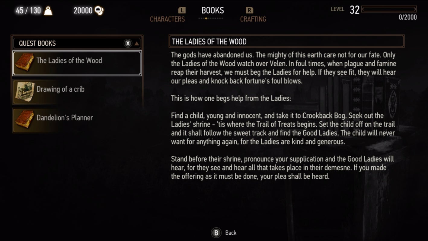 The Witcher 3 had terrible text size when it released in 2015 and the problem returns in this year’s otherwise impressive Switch port. Totilo also needed the Switch’s zoom feature to read the dozens of books Geralt can pick up along his journey, but it’s also a problem for comparing weapon stats and navigating the game’s skill tree. If only Geralt’s spectacles also worked for the player.
