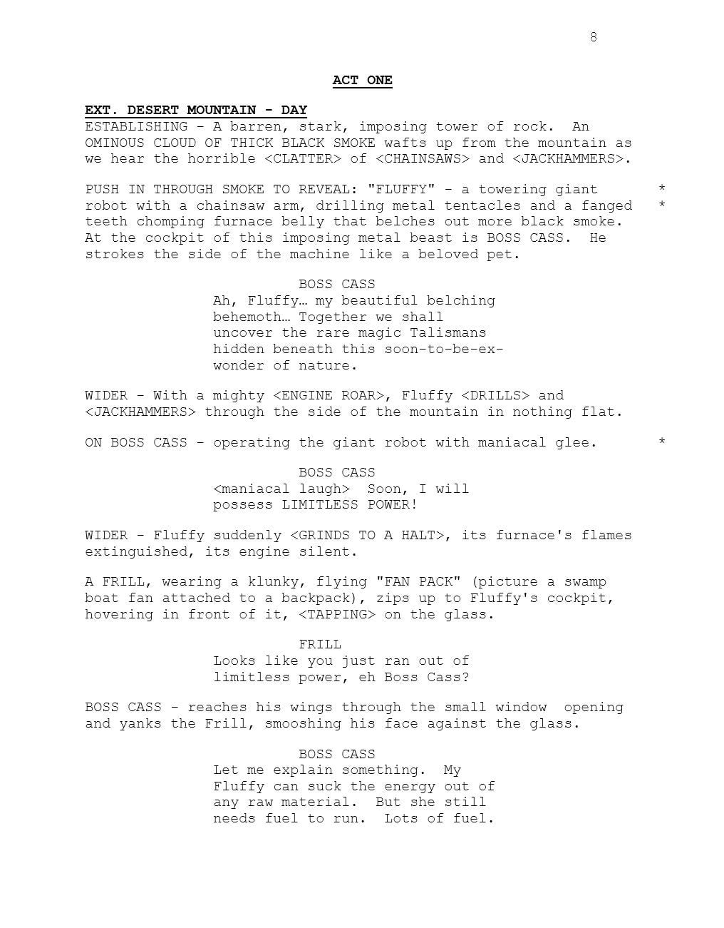 The first act of the pilot episode features the antagonist of the Ty games, Boss Cass, sitting inside a mech suit with a chainsaw. The mech, Fluffy, needs a lot of fossil fuels to run, so the evil cassowary decides to strip mine a mountain: