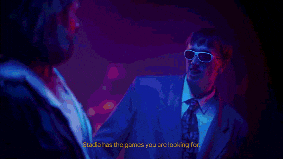 Another part of the trailer has a man in a club, who later becomes a canoe (WACKY!), mention that Google Stadia “…has the games you are looking for.”