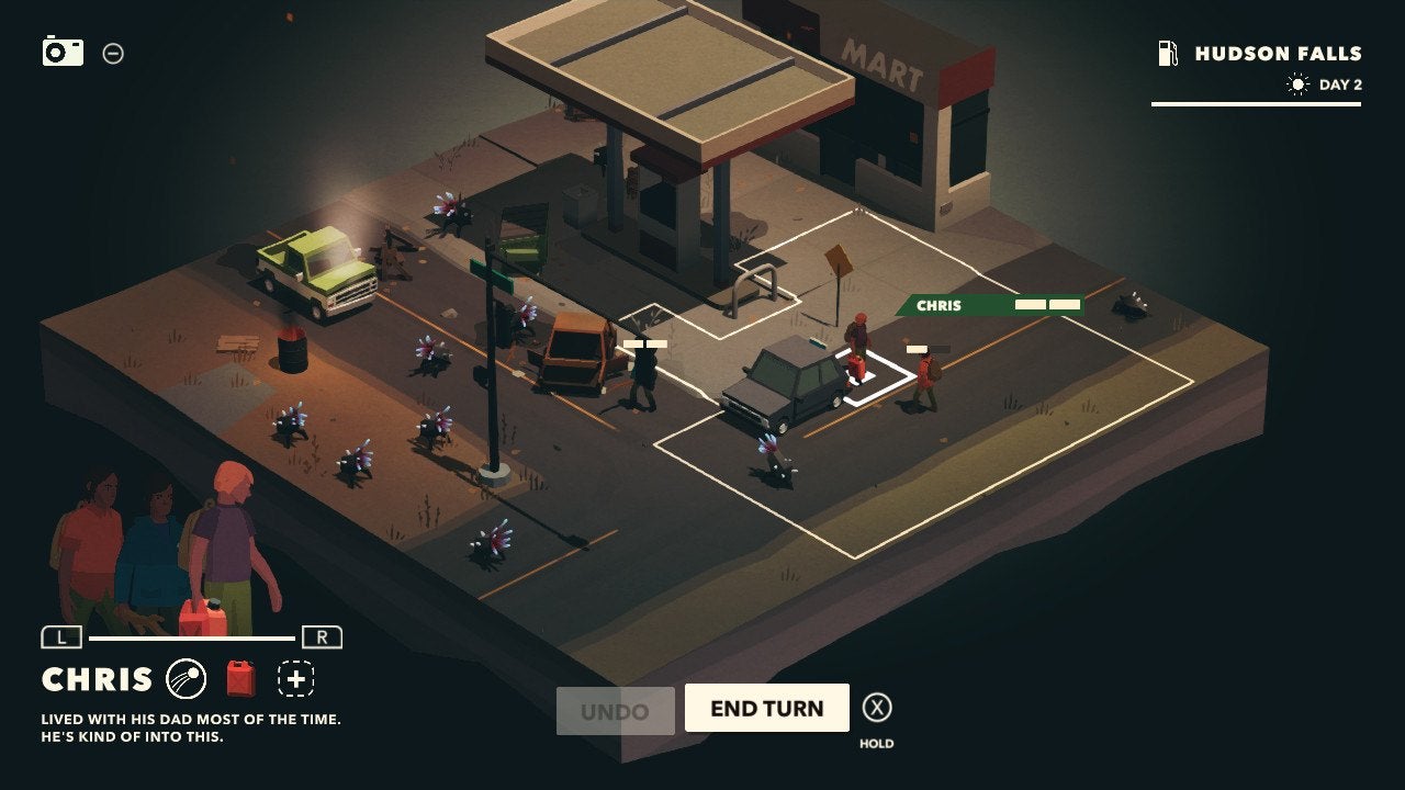 Overland is a game by Finji, out today for PC, Switch, and Apple Arcade (Correction 2:03pm—Overland is also available for Xbox and PS4.). It takes place in a ravaged America beset by spiky monsters. They’re attracted to sound, and they call up reinforcements from underground when they’re injured or killed. At the start of the game, you’re assigned a random survivor and a car that’s running low on gas. Each level is a diorama-esque grid that you move across, gathering supplies, fighting or avoiding monsters, and saving other survivors to add to your road trip across America.