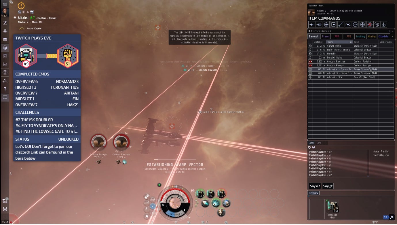At 10 PM CST on October 31st, Twitch Plays EVE came online for the first time. Johnny Splunk hosted the stream on his own Twitch channel and fielded any questions players might have about the experience, but he did not interfere in the activities of the stream, allowing viewers full control of a character. For the first hour of the stream, an audience of around 100 viewers watched the spaceship under their direct control move back and forth along one of EVE’s most popular trade routes, attempting to get from one end to the other so that they could collectively complete one of the challenges laid out to them by the stream’s moderator team.