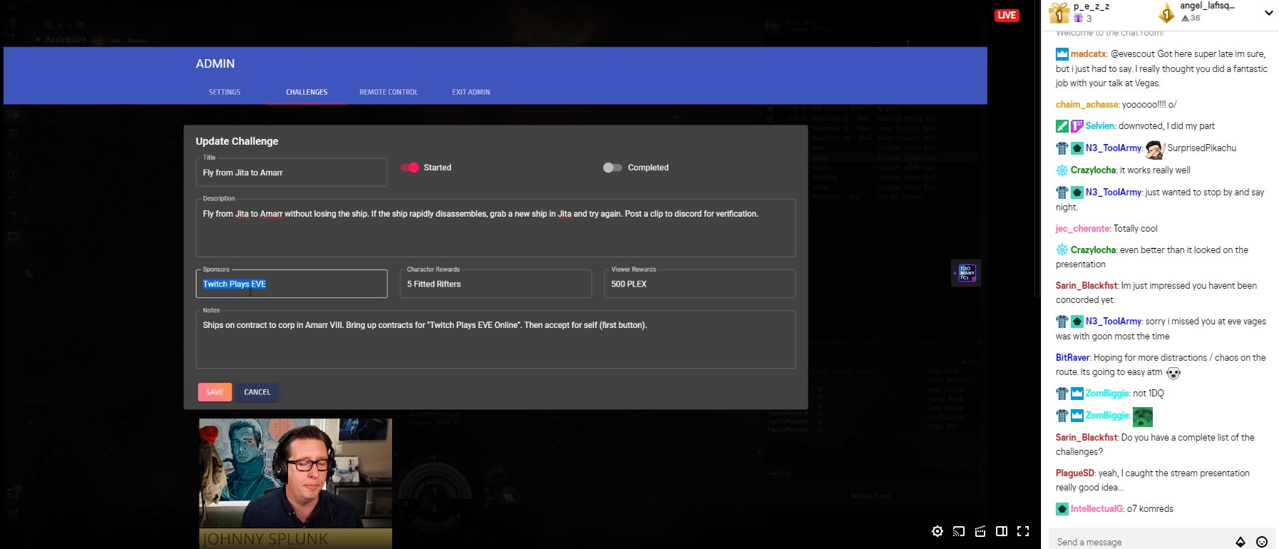 According to Johnny during the inaugural stream, the addition of the challenges was to add an RPG-like element to the stream and give viewers goals to work towards together, rather than leaving the experience a complete sandbox. The challenges come with two sets of rewards: one for the in-game character, and one for the viewers themselves. When a challenge is complete and the evidence is posted on the Twitch Plays EVE Discord, viewers are rewarded by the mod team with with ships, in-game currency, skill training, or other various in-game bonuses to progress the character. In addition to the character reward, viewers active when a mod acknowledges a completed challenge are able to enter into a drawing to receive a prize to their EVE Online character.
