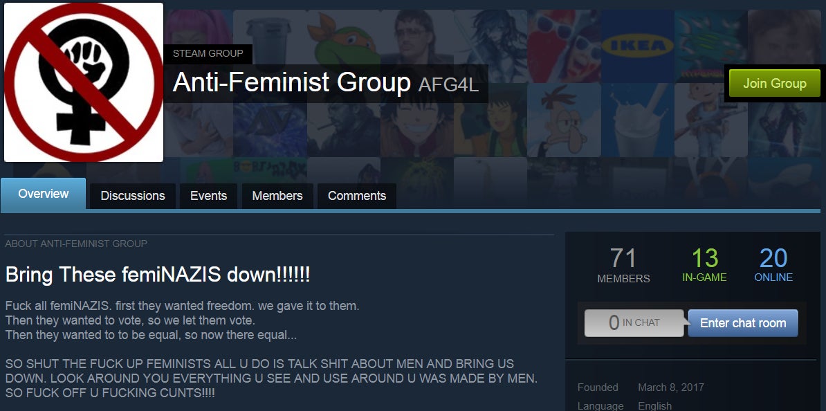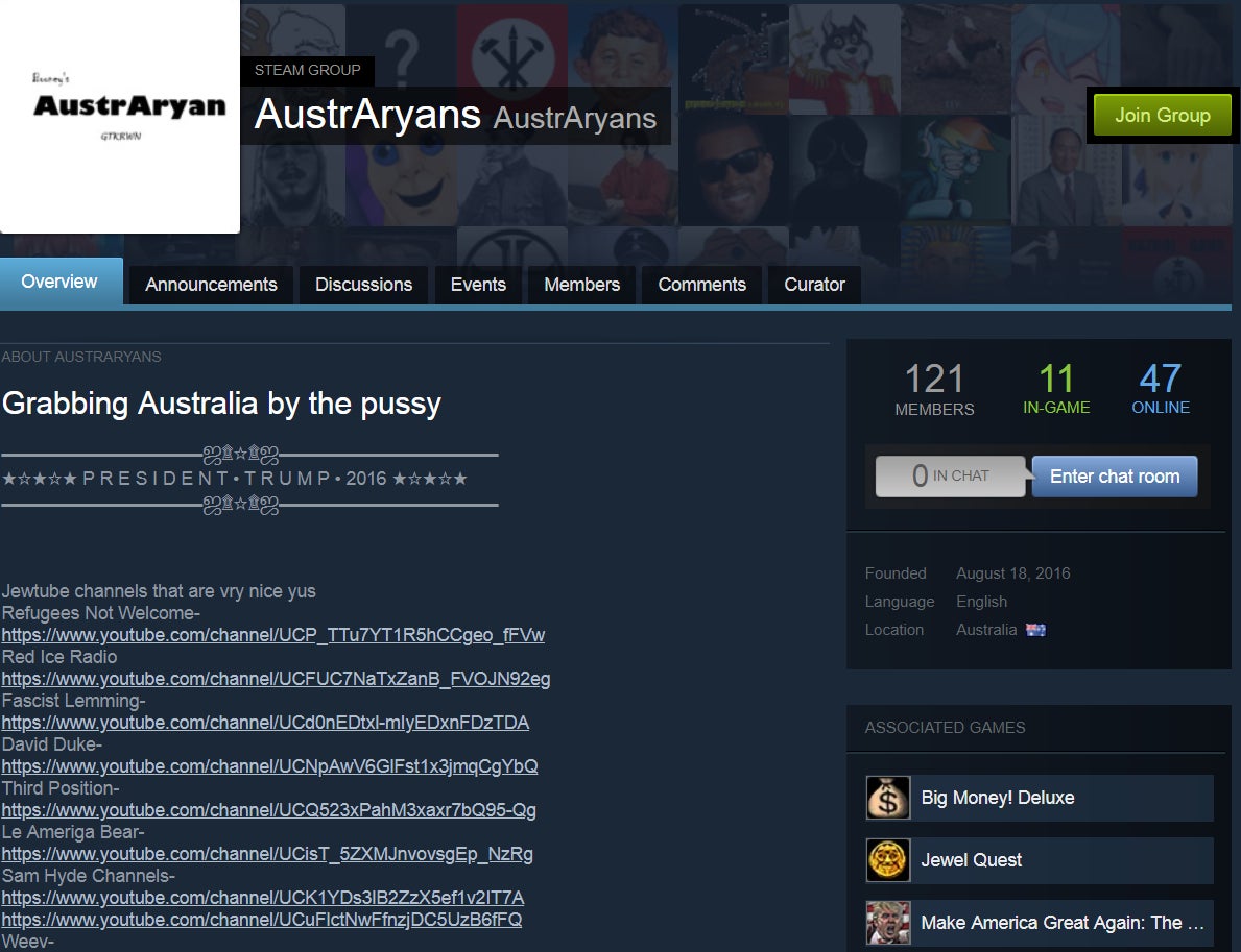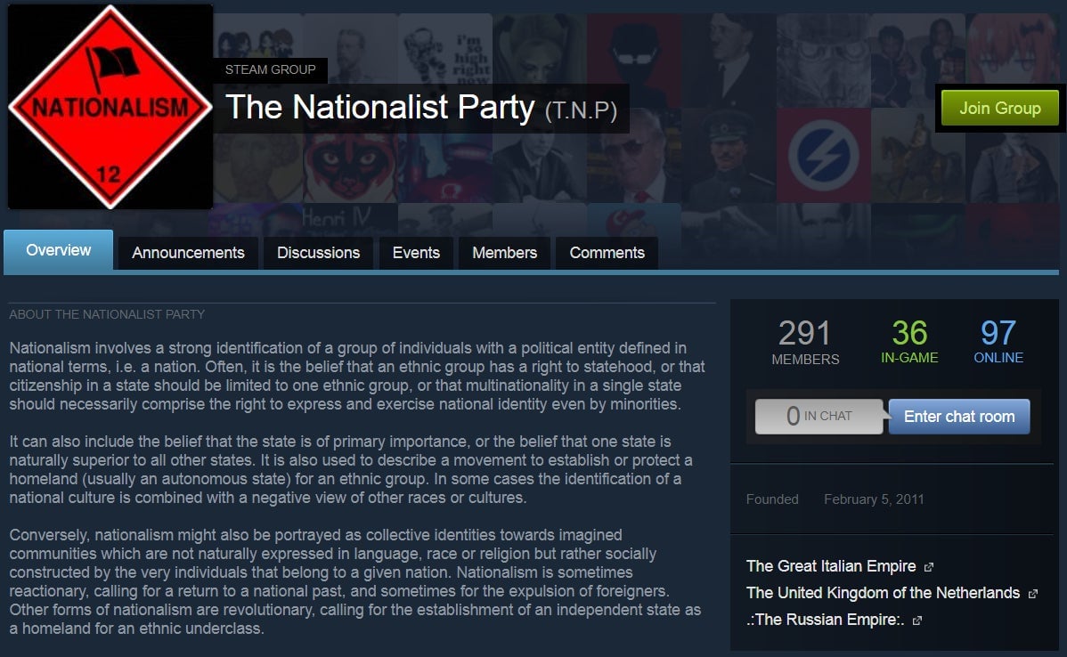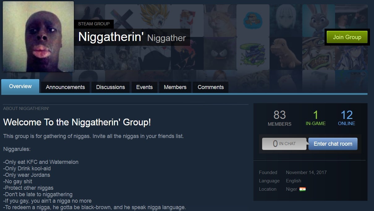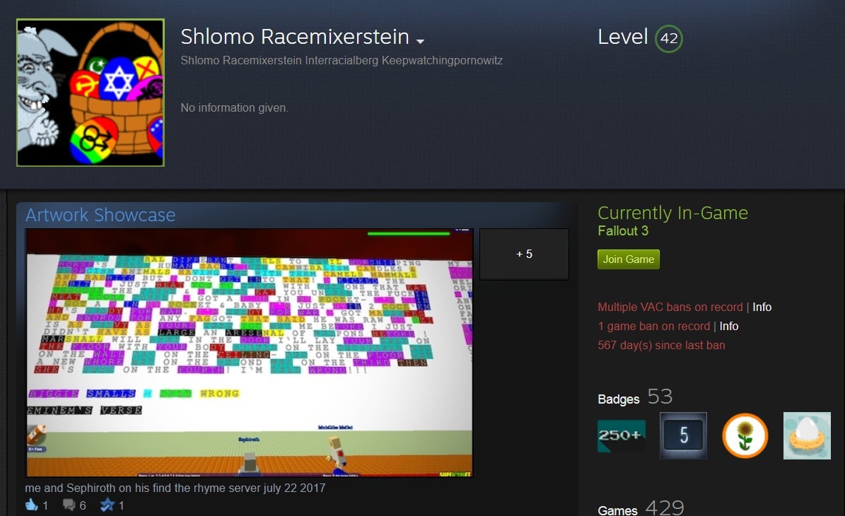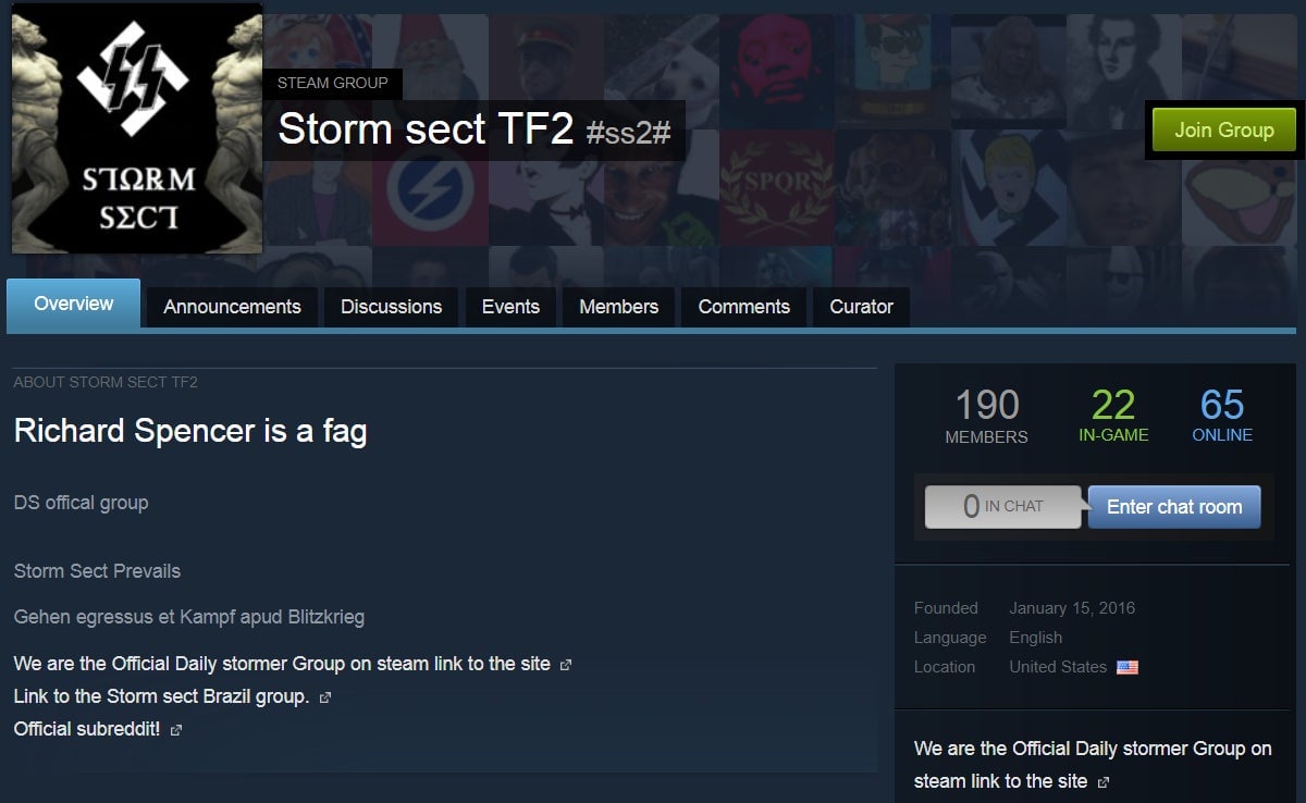 That said, Steam still contains quite a few groups and users who profess to racist or otherwise hateful leanings. For example: