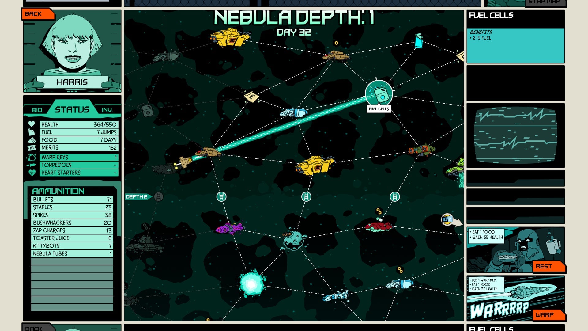 Essentially, Void Bastards breaks down into two quests. A larger and longer quest to collect something in the galaxy map and a smaller quest found in each ship to collect a specific part, which can be used to make new gear or weapons. Traveling around the map costs fuel and food. Run out of food and you will starve, run out of fuel and you are stranded.