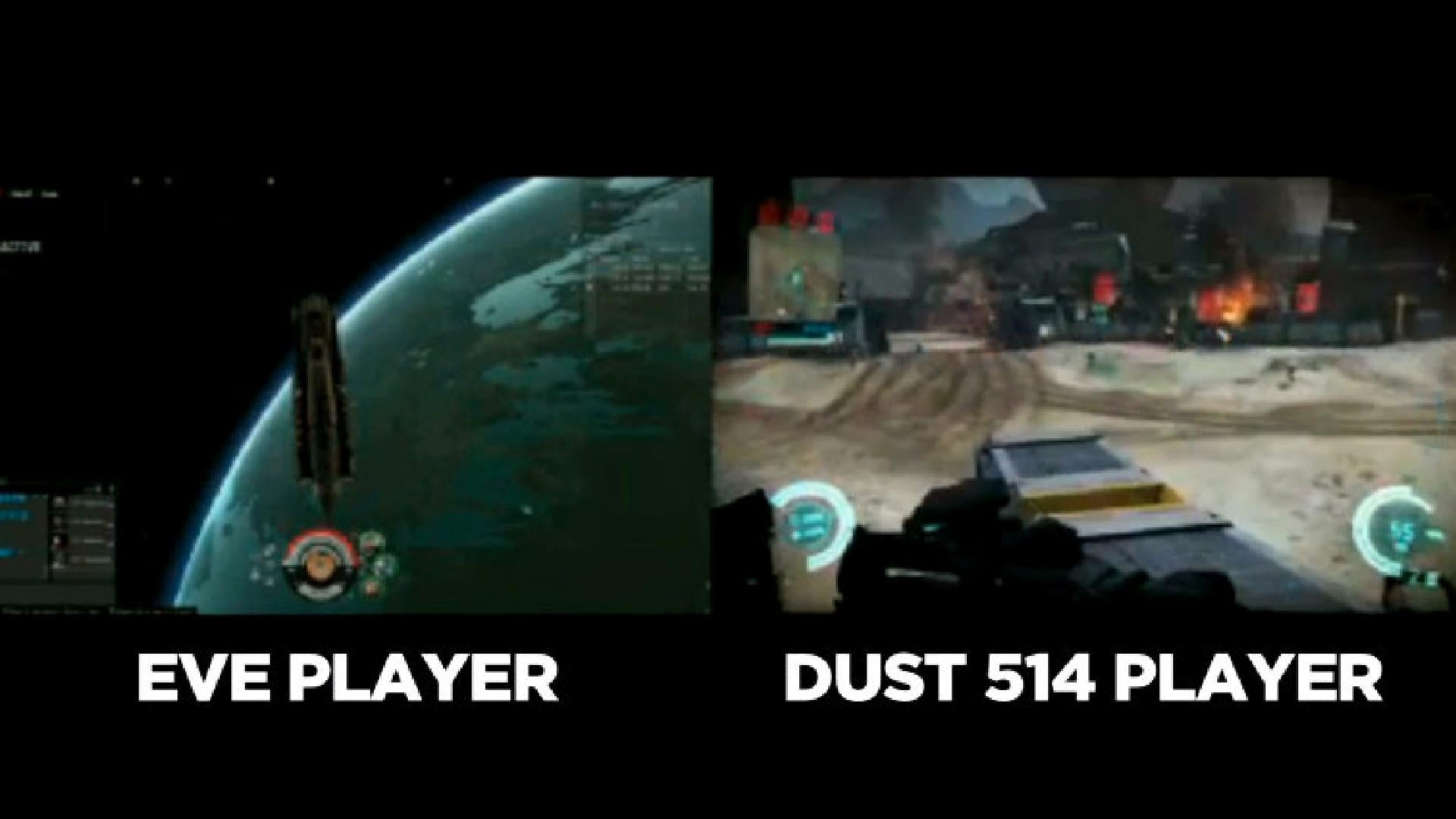 On the left is Eve Online, a spectacular sci-fi massively multi-player game, which you can play on a computer. On the right is the upcoming first-person shooter, Dust 514, which you will be able to play on a PlayStation 3.