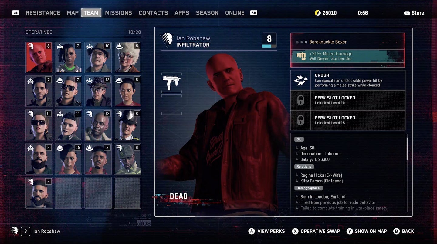In a gameplay demonstration of Watch Dogs Legion that kicked off Ubisoft’s E3 2019 press conference today, the player hopped between different recruited operatives to perform different tasks. There are characters good at infiltration, some better with full-on combat. In the mission shown, players are attempting to recruit a character who can handle drones, useful for a future mission.