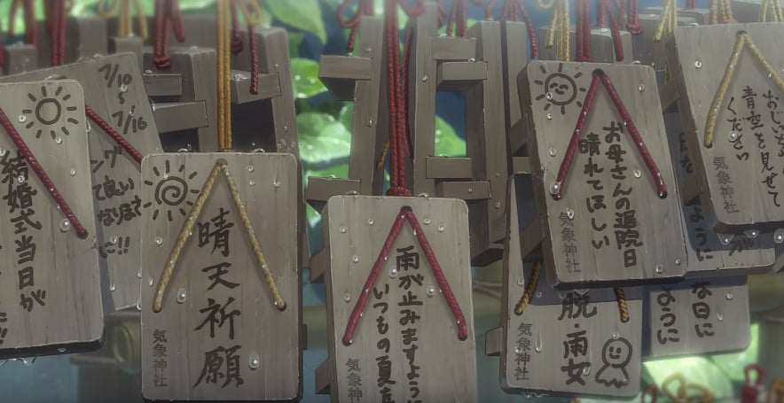 Also as in Your Name, Shinkai once again makes striking contrasts between these elements of traditional Japanese culture and modern life. For example, teru teru bozu, which look like little ghosts, appear throughout the film. Teru teru bozu literally means âshrine shrine Buddhist priest,â and these little talisman are still made today out of tissue paper, typically by children praying for clear skies. Just like in Japanese society, Buddhist and Shinto beliefs exist side by side in Weathering With You.