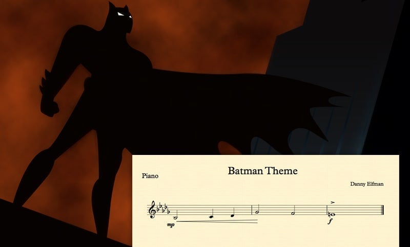 The opening five-note motif perfectly projects an image of the caped crusader standing alone. The melody is low and menacing, all flatted thirds and sixths, dark and brooding and decidedly minor. The Bat stands on a rooftop like a gargoyle, surveying his city.