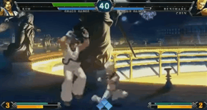 Evo 2013 King of Fighters XIII grand finals. Hee Son Woo (Kim) vs Reynald (Benimaru). Reynald uses drive cancels for a combo to turn the match around at the last second.