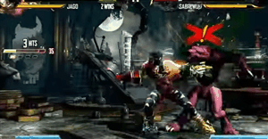 Socal Regionals, Killer Instinct Top 8. Chris G (Sabrewulf) vs Mr.Grimmz (Jago). The exclamation point means that Saberwulf is unable to combo break for three seconds after incorrectly attempting one already, but he manages to get it right the second time.
